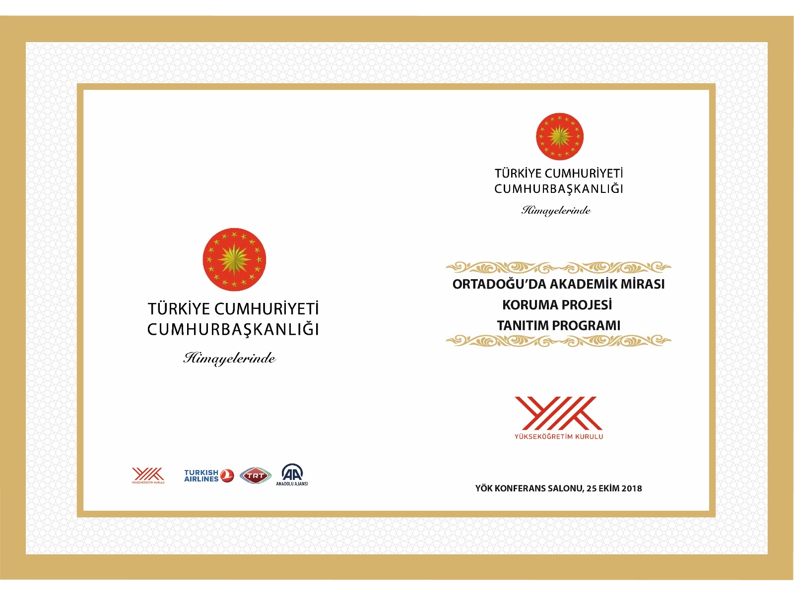 Ortadoğu’da Akademik Mirası Koruma Projesi Tanıtım Programı Sayın Cumhurbaşkanı Yardımcımız Fuat OKTAY'ın teşrifleriyle Yükseköğretim Kurulu Başkanlığı konferans salonunda gerçekleştirilecektir.
